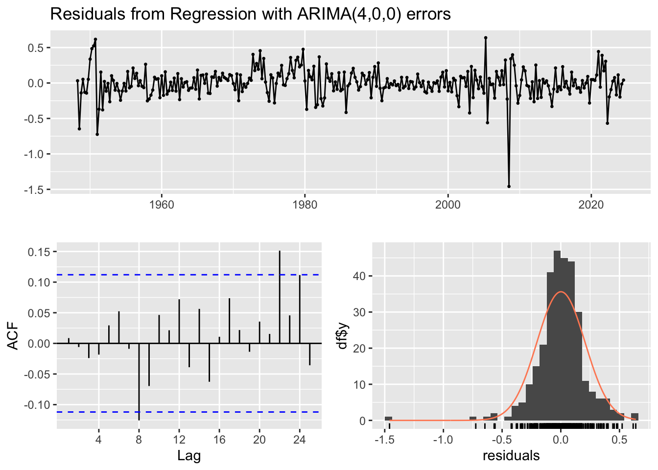We improve upon this by fitting an ARIMA model with exogenous regressors using forecast::auto.arima(), which also allows for seasonal ARMA components. The best-fit specification is an ARIMA(3,0,3)(2,0,2)[4], indicating both short- and medium-term seasonal effects.